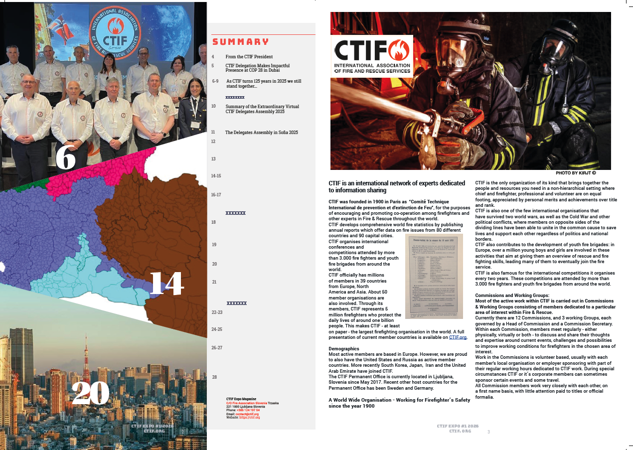 It has been a big year for CTIF with many collaborations and projects around the world. The magazine will feature some of of our major news relating to our internal affairs, collaborations and projects around the world. It will have cover a variety of topics with a focus on first response and civil defence. It will also contain an extensive article celebrating the 125th Anniversary of CTIF.
