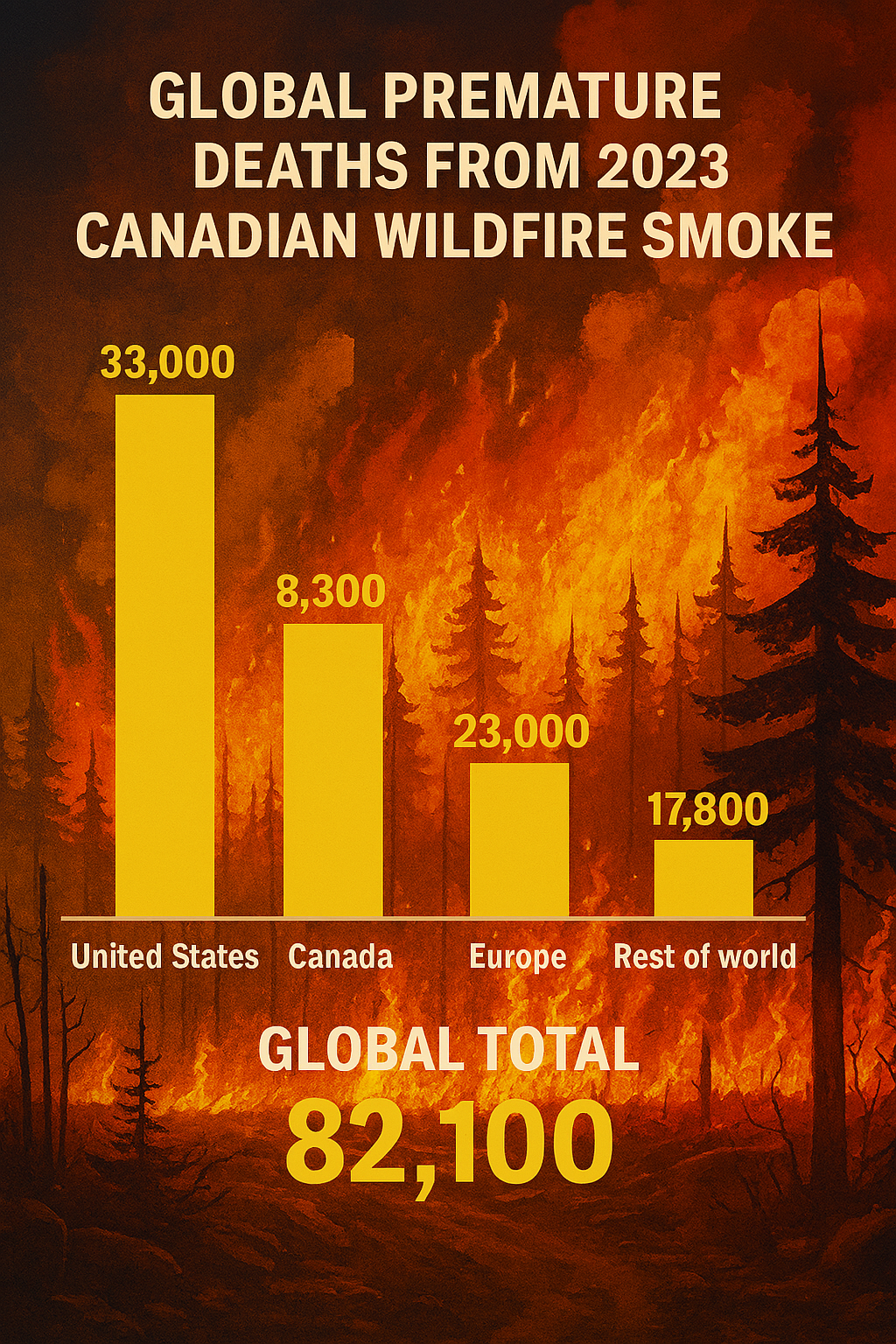 - 2023年,加拿大的野火占全球火灾相关PM2.5暴露量的13%,烟雾蔓延到整个北美和西欧。